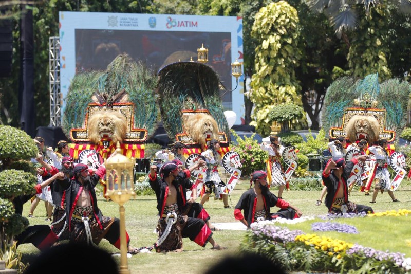 Sebagai penutup, panggung Grahadi bergemuruh dengan tarian kolosal Reog Ponorogo oleh ratusan mahasiswa Universitas Brawijaya yang menampilkan perpaduan kekuatan, seni, dan kebanggaan budaya daerah.