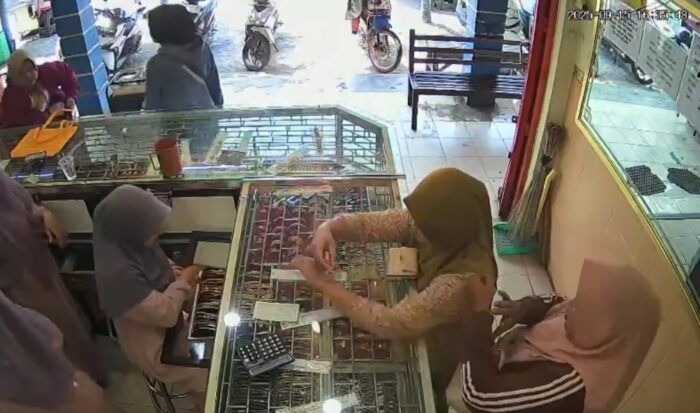 “Dua orang pelaku ibu-ibu berjilbab, satunya berkacamata, yang satunya agak berisi. Dari tiga gelang emas yang dikeluarkan, satu hilang dibawa kabur,” ungkap Hj. Ainin, pemilik Toko Kalimas, Kamis (18/9/2025) saat di konfirmasi.