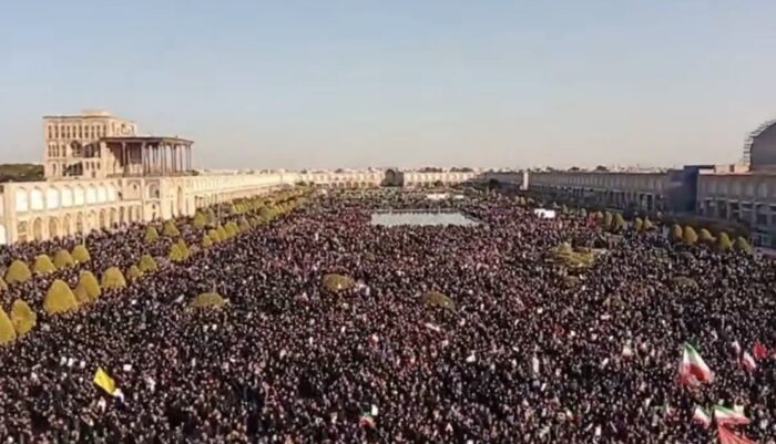 Lautan manusia terlihat memenuhi Naqsh-e Jahan Square. Mereka membawa bendera serta poster sebagai tanda penghormatan terakhir.