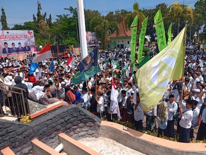 PROBOLINGGO,- Ribuan santri dan masyarakat Kabupaten Probolinggo turun ke jalan menggelar aksi damai bertajuk Bela Kiai, Bela Pesantren, di depan kantor DPRD Kaabupaten Probolinggo, Minggu (19/10/2025).